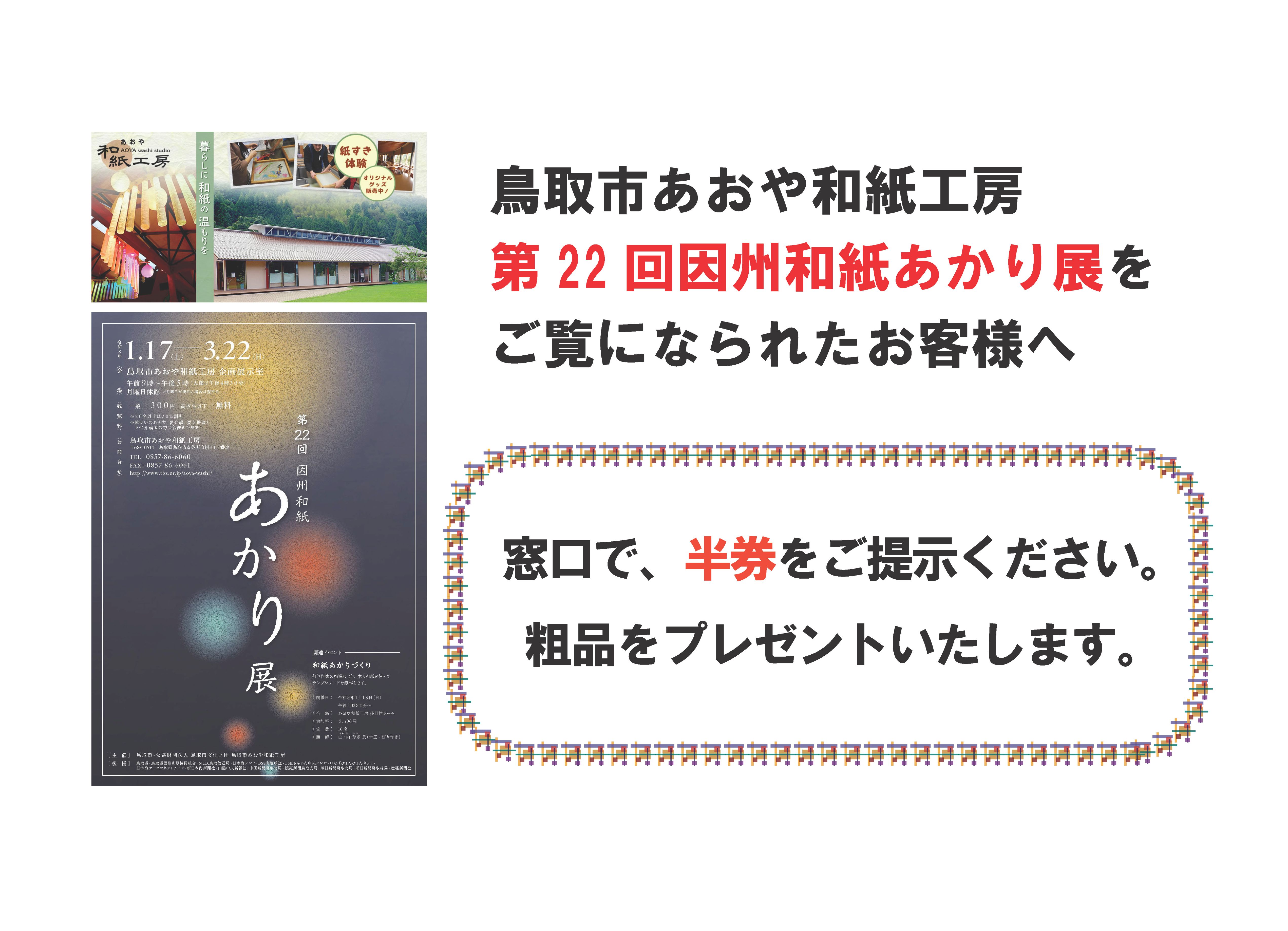 2026.1.18 鳥取市あおや和紙工房「第22回因州和紙あかり展」をご覧になられたお客様に粗品進呈中! 鳥取市あおや郷土館では、現在、鳥取市あおや和紙工房で開催中の「第22回因州和紙あかり展」の入場券の半券を、窓口でご提示いただいたお客様に粗品を進呈しております! あおや和紙工房のあかり展をご覧いただきましたら、是非あおや郷土館へもお立ち寄りください。 前の記事 お知らせ一覧へ戻る