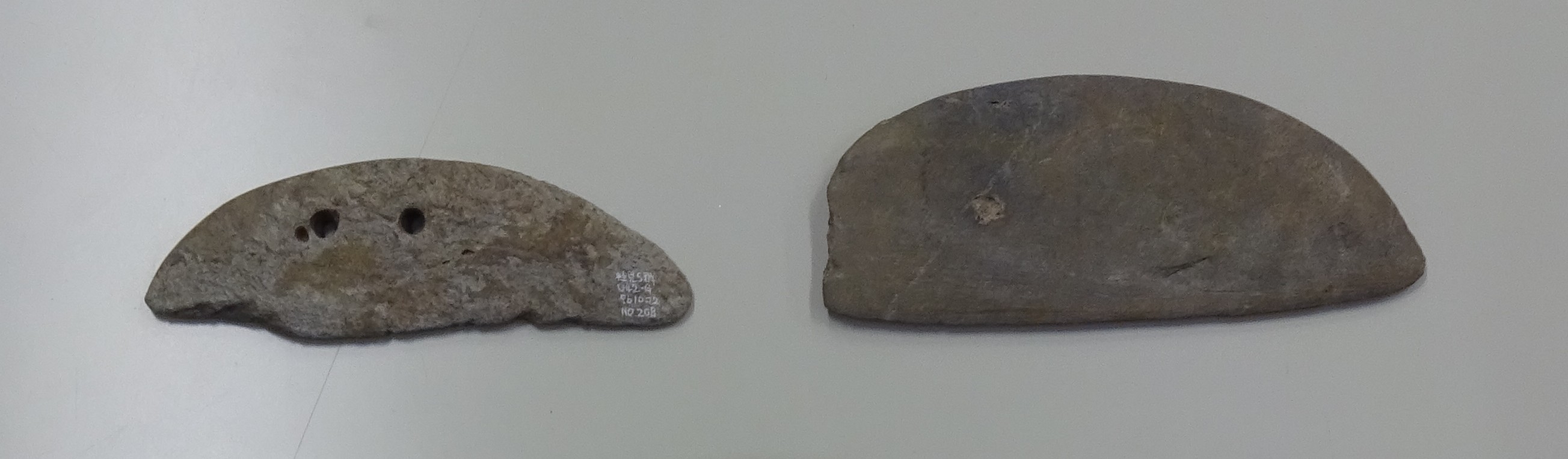この写真は市内の東桂見遺跡から出土した弥生時代後期~古墳時代前期頃の石包丁(左)とその未成品(右)です。現在やまびこ館地下1階の常設展示室に他の未成品や上述の田下駄などと一緒に展示しています。板石にあけた穴にひもを通し、それに指を入れて包丁本体をしっかり持ち、稲の茎に刃を当てて穂首部分を切り取ったのでしょう。当時はまだ稲の育成にもばらつきがあったのか、稲穂が実ったものから順に摘み取る穂摘みのほうがかえって効率が良かったのかもしれません。